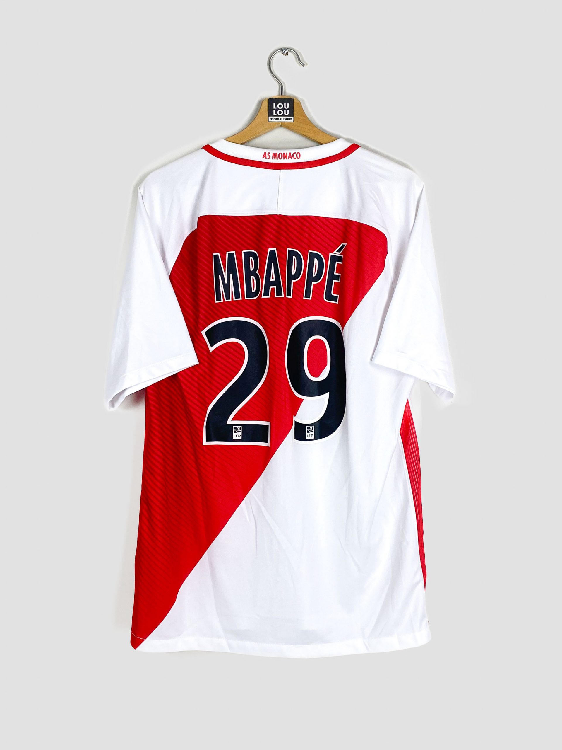 Louloufootballshirt vous présente ce magnifique et très rare Maillot de l’AS Monaco floqué Kylian Mbappe. Il s’agit de la version domicile que porteront les monégasques lors d’une saison exceptionnelle où ils remporteront le titre en Ligue 1 et parviendront jusqu’en demie finale de la Ligue des Champions (élimination contre la Juve).