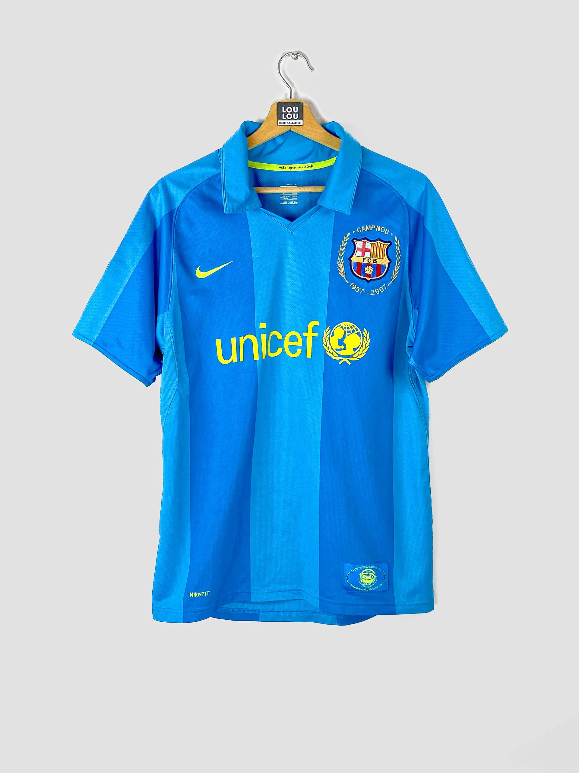 Nous vous présentons ce maillot du FC Barcelona saison 2007-2008. Il s’agit du maillot extérieur que porteront les hommes de Franck Rijkaard cette année là.