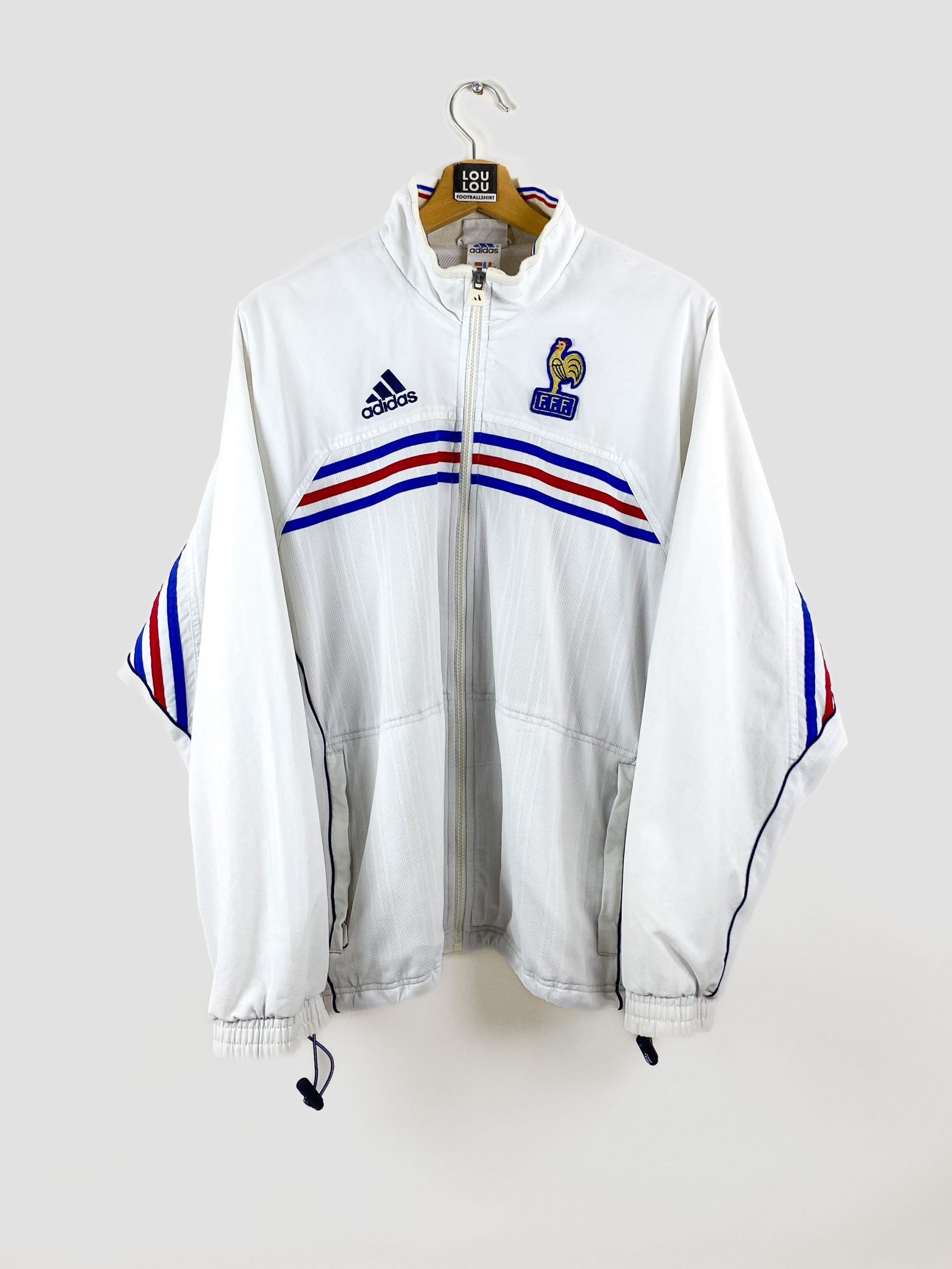 Louloufootballshirt vous présente cette veste de l’équipe de France 98 portée par les joueurs lors de la coupe du monde à domicile. L’équipe de France remportera la coupe du monde avec une victoire 3-0 face au Brésil en finale, au Stade de France.