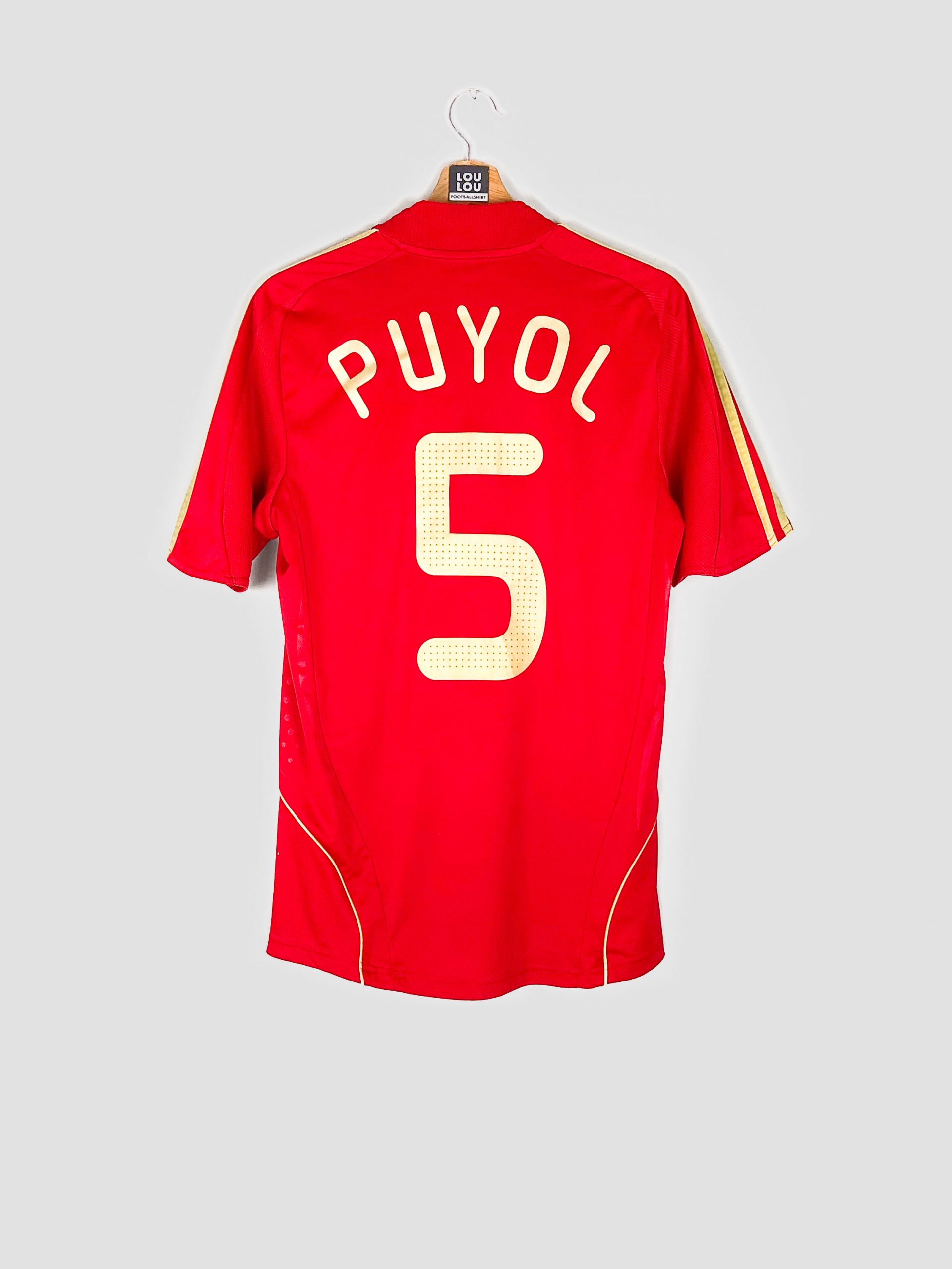Nous vous présentons ce Maillot de l’Espagne floqué de la légende Carles Puyol époque 2007-2009. C’est le maillot domicile que les Espagnols porteront notamment lors de l’euro 2008 organisé par l’Autriche et la Suisse. Lors de l’Euro, la Roja dirigée par Luis Aragones remportera la finale face à l’Allemagne 1-0 grâce à un but de la légende Fernando Torres. David Villa terminera meilleur buteur de la sélection espagnole mais se blessera en demi-finale et ne pourra disputer la finale.