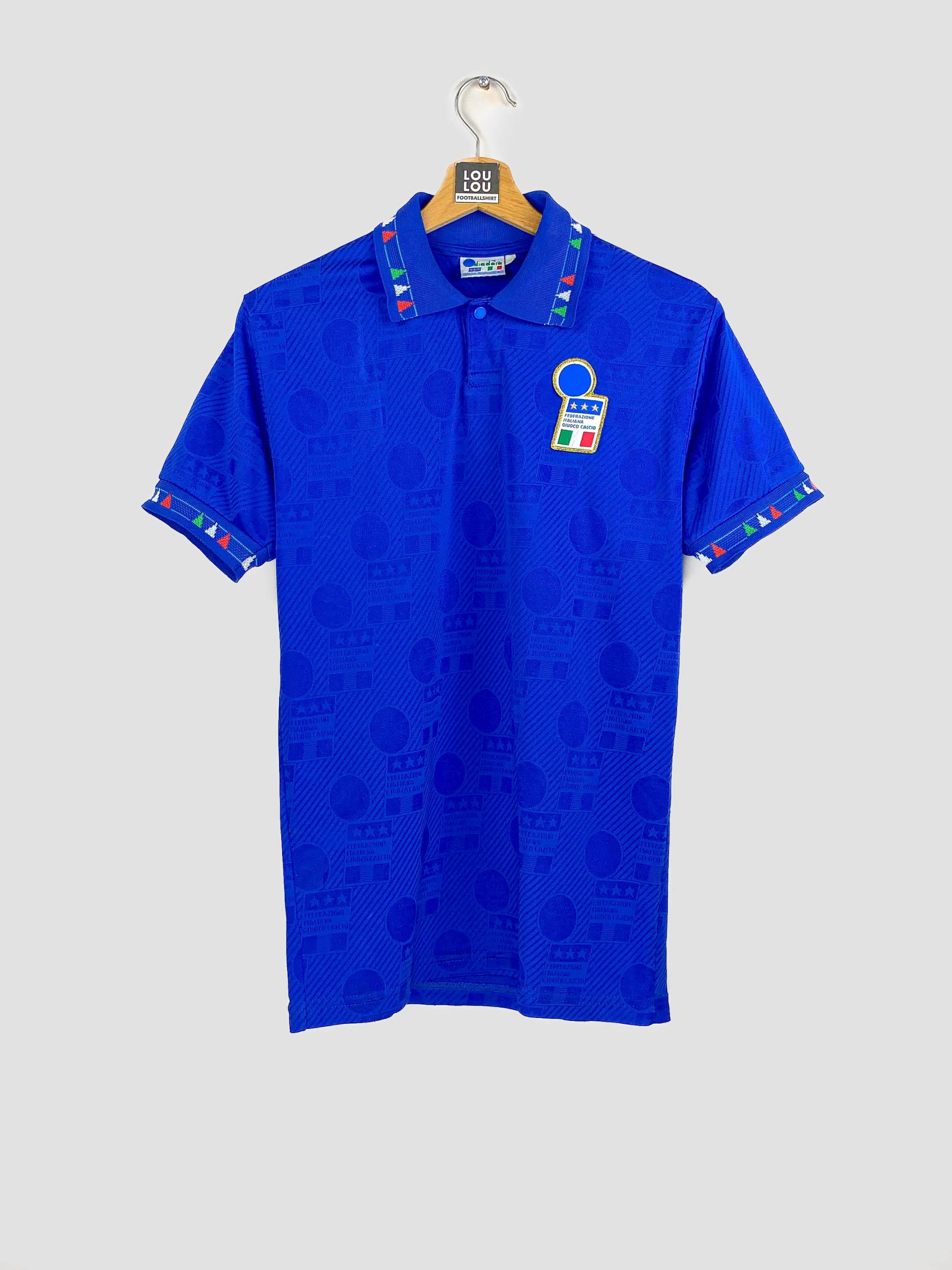 Louloufootballshirt vous présente ce magnifique maillot porté par l’Italie lors du Mondial au USA en 1994. Les hommes de Sacchi réaliseront un parcours magnifique jusqu’en finale où ils finiront par s’incliner au tir aux but face au Brésil après un score nul et vierge de 0-0. Roberto Baggio terminera meilleur buteur de la nazzionale avec 5 buts.