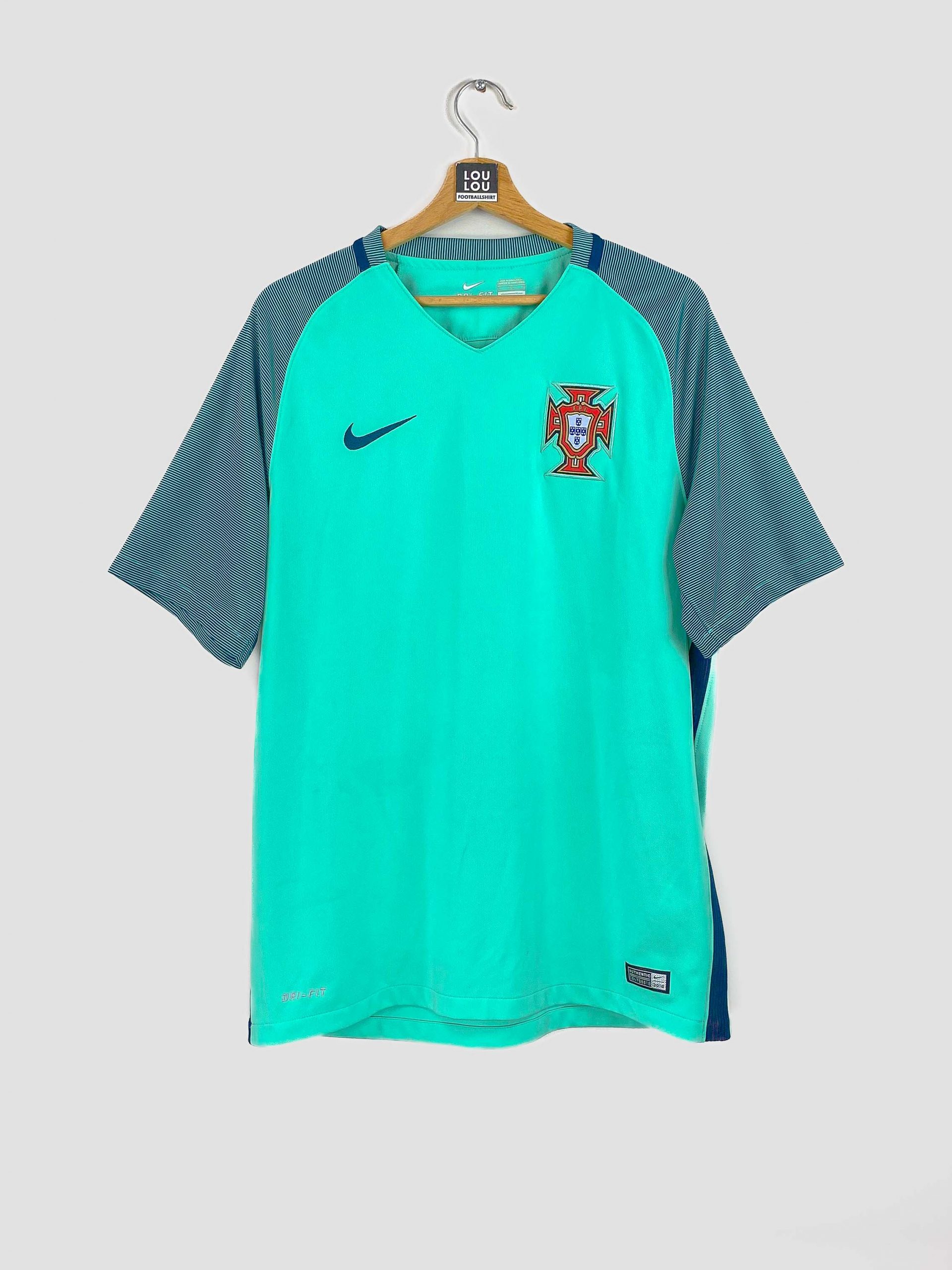 Revivez l’incroyable parcours de l’équipe du Portugal lors de l’Euro 2016 en France avec ce maillot extérieur porté lors de cette compétition mémorable. Ce maillot symbolise l’esprit de victoire et de persévérance des champions d’Europe. En très bon état, il a été porté par les joueurs lors des matchs disputés durant ce tournoi historique.