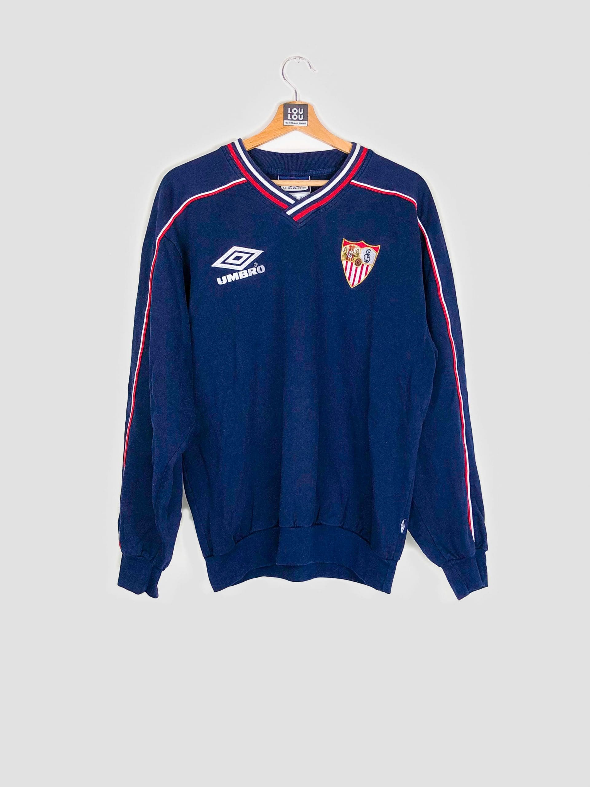 Nous vous présentons ce pull vintage du FC Seville saison 1998-1999. Sponsorisé par l’équipementier Umbro, ce pull porté par les sevillans symbolise une renaissance pour les hommes mené par Marcos Alonso qui terminent 4ème en Liga B et se qualifient donc pour les play-offs. Ils remporteront leurs confrontation face au sous-marin jaune de Villareal et accèderont à l’élite.
