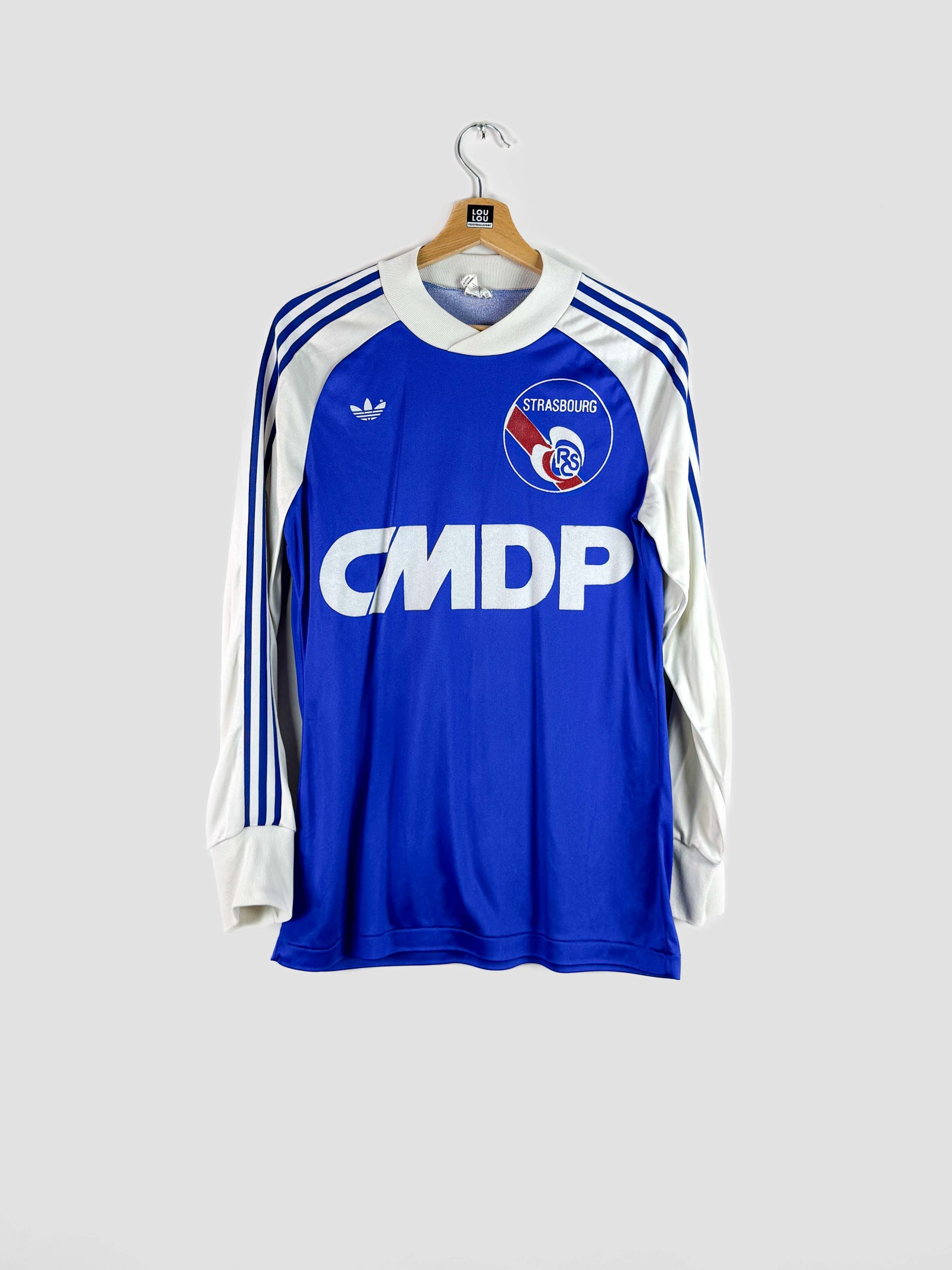 Ce maillot domicile du RC Strasbourg rappelle la fabuleuse saison 1978-1979, lorsque le RC Strasbourg décroche pour la première fois le titre de champion de France. Sous la houlette du jeune entraîneur Gilbert Gress, les « Bleu et Blanc » dominent le championnat dès les premières journées, ne quittant plus la tête du classement jusqu’au sacre final. L’équipe strasbourgeoise, riche en jeunes talents alsaciens (Dominique Dropsy, Raymond Domenech, Léonard Specht, Roland Wagner…) et en joueurs d’expérience, a également brillé en Coupe de France (demi-finaliste) et en Coupe UEFA cette année-là (huitièmes de finale). Cette reproduction fidèle du maillot vintage, avec son design Adidas Ventex à manches longues, son logo rétro et son sponsor d’époque (CMDP), incarne l’esthétique des années 70. Objet de collection convoité par les passionnés de football vintage, il offre un témoignage authentique de la glorieuse épopée alsacienne de 1978-1979.