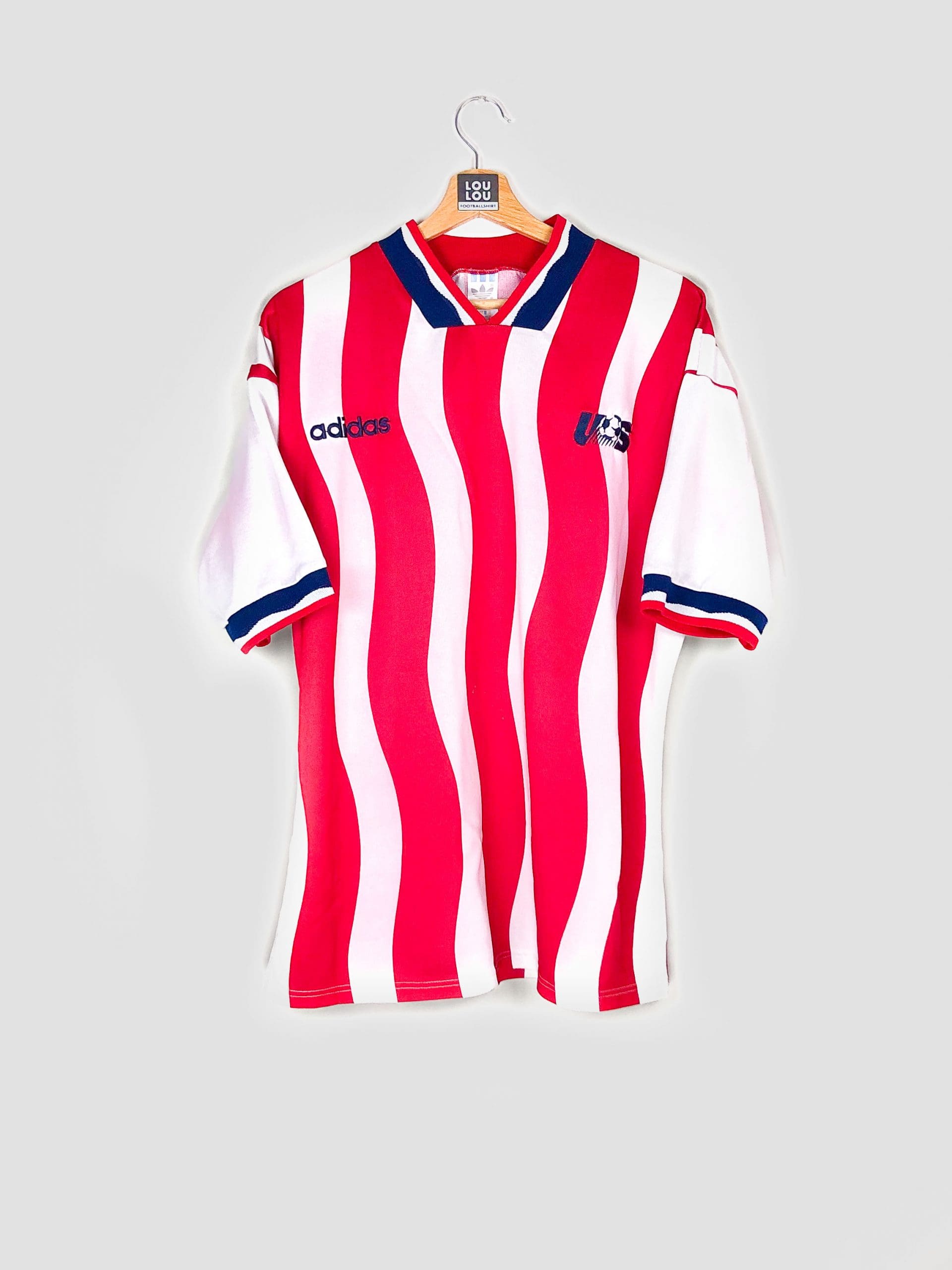 Louloufootballshirt vous présente ce maillot très rare des Etats-unis porté par les américains lors de la coupe du monde 1994. Ce maillot est très rare et très prisé des américains puisque qu’ils étaient en 94 les organisateurs de la coupe du monde.